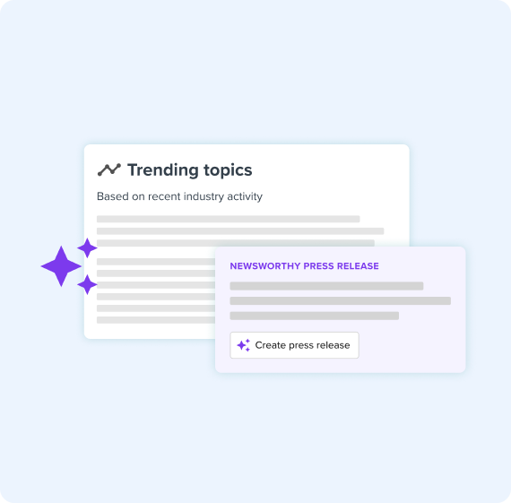 Keep a pulse on the market with industry insights featuring trending topics and relevant stories. Search for a topic, brand or industry and let AI suggest newsworthy press release ideas. Our tool surfaces trending questions, keywords and hashtags so you can quickly understand what’s resonating with audiences.